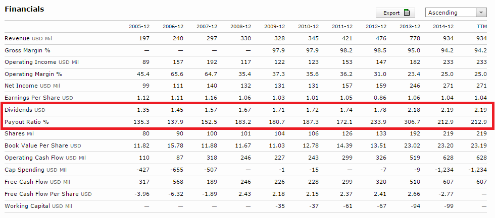 Efectivamente la empresa ha incrementado los dividendos casi 80 veces, y durante años y años, pero al menos en los últimos 10 a costa de incrementar el payout, es sostenible un payout por encima de 200 de forma recurrente??