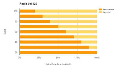 […] En esta entrada sobre planes de pensiones ya hablamos de la regla 120 (hay variante de 100), por la que deberíamos estar invertidos ese número menos nuestra edad en renta variable. Es decir, alguien de 20 años, si aplicamos la regla 120, debería tener 100% en renta variable, y alguien de 60 años, el 40%: […]