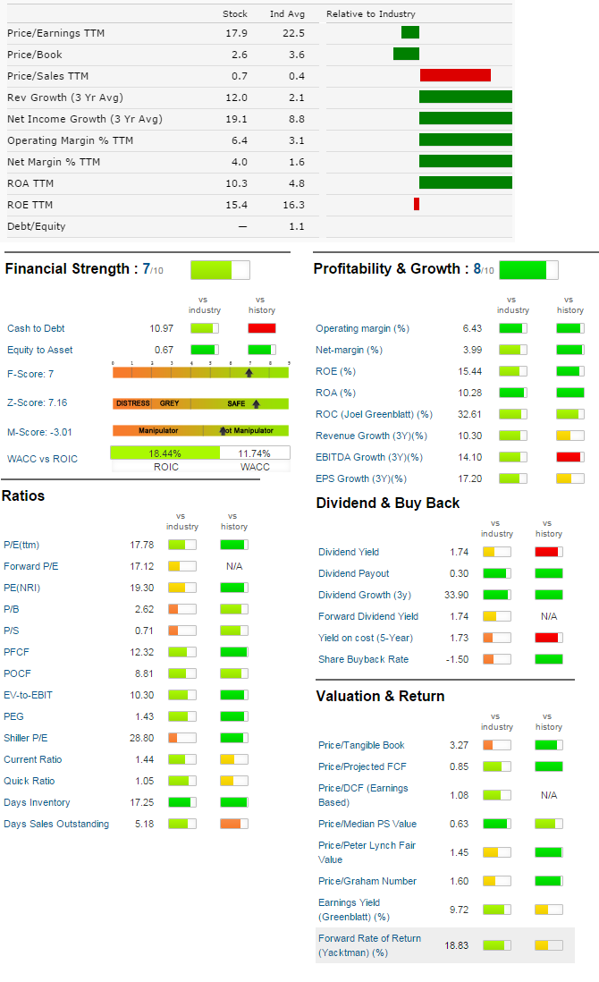 Valor intrínseco de Graham: 45,3$ (considerando yield bono 3% y un crecimiento de beneficios del 5% anual, muy modesto, ya que ha crecido al 10% anual de media)