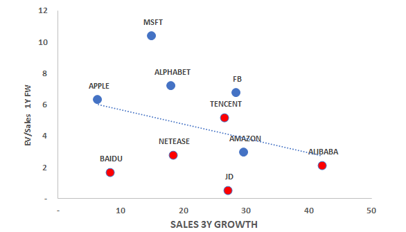 Y crecimiento de ventas vs EV/Ventas a 1 año vemos que las que guardan una correlación estrecha por el tipo de negocio son Jd.com y Amazon: