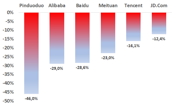 Si hacemos un zoom en las principales empresas tecnológicas chinas, vemos primero la caída desde el máximo del último año: