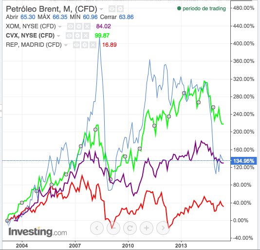 Vemos la evolución a corto plazo del barril Brent (en azul) vs las 2 petroleras principales americanas, Chevron (CVX) y Exxon (XOM) y «nuestra Repsol: