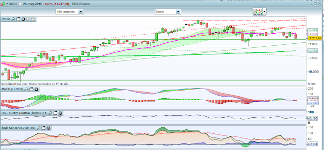 El aspecto técnico a corto plazo en el gráfico diario no es particularmente alentador, con un MACD cortado a la baja y la MM30 superada, si rompe claramente los 11.200 el siguiente nivel serán los 11.000 pero el soporte de verdad como hemos comentado en anteriores semanas se encuentra en los 10.800. En cualquier caso en el gráfico diario vemos que sigue el movimiento lateral entre esos 10.800 y los 11.600 aproximadamente,