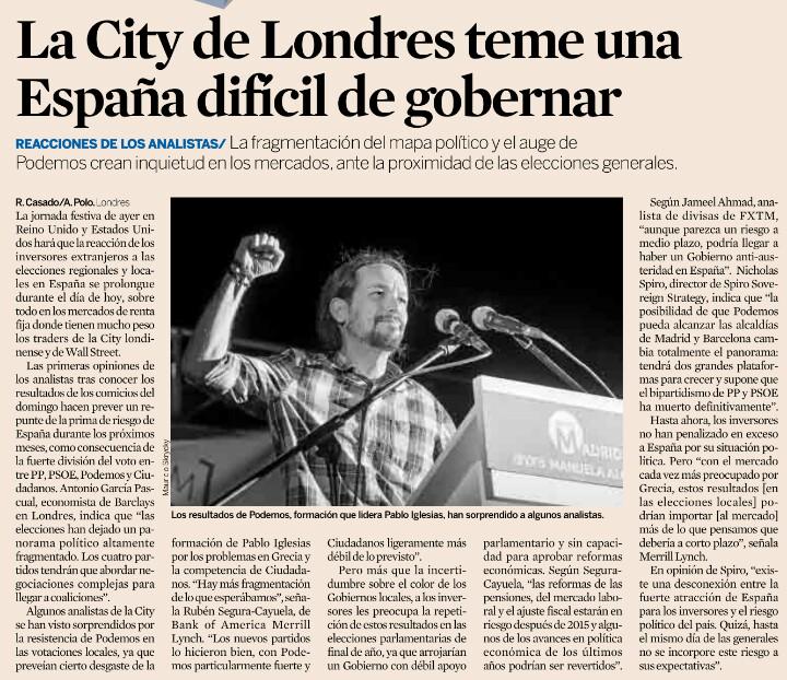 Huida de capitales: En el primer trimestre salieron de España 19.400 millones de euros, vs 800 en el marzo del año anterior.Es cierto que no es atribuible aún a las elecciones locales, pero si que Grecia + incertidumbre política genera dudas, y no hay nada más miedoso que el dinero, este segundo trimestre seguro que se ha acentuado el éxodo de dinero.