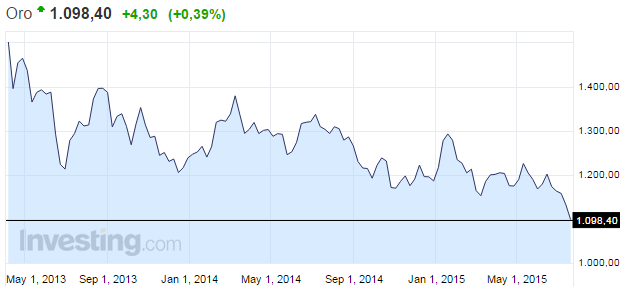 El oro está en boca de muchos…pero ara mal ya que como vemos sigue en caída libre desde máximos de 2012, en plena crisis. Ya hemos hablado de él a nivel histórico en esta entrada, y conceptualmente en esta otra. En breve publicaré una entrada sobre productos para invertir en oro. Pero de momento, la tendencia sigue siendo bajista, hasta cuando?